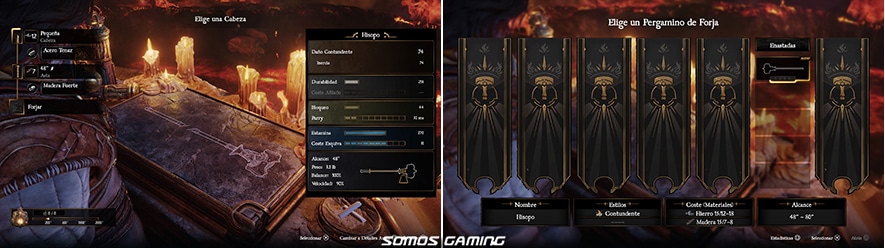 Para lograr una sintonía perfecta deberemos obtener diferentes armas para ir cambiándolas según el enemigo al que nos enfrentemos y atacar como mejor nos venga para así afrontar sus puntos débiles. Por ello, mediante la exploración, la campaña y los enemigos derrotados, desbloquearemos planos de diferentes armas. Las cuales deberemos forjar con materiales que obtendremos de la misma forma. Desde los yunques, donde podremos descansar, también podremos ir a la forja. Aquí pasaremos por una serie de opciones (empuñadura, filo, etc.) para crear el arma uniéndolo a metales de distinto tipo para que cada una sea distinta. En cuanto esté todo preparado, nos tocará moldear el arma a golpe de martillo forjador. Nos saldrá una barra que deberemos aplanar lo máximo posible para mejorar la calidad del arma. Por cada estrella obtenida podremos reparar el arma una vez más. Si, las armas se rompen, y llegará un momento en el cual ya no serán útiles, por ello es importante crear una diversidad de equipamiento.