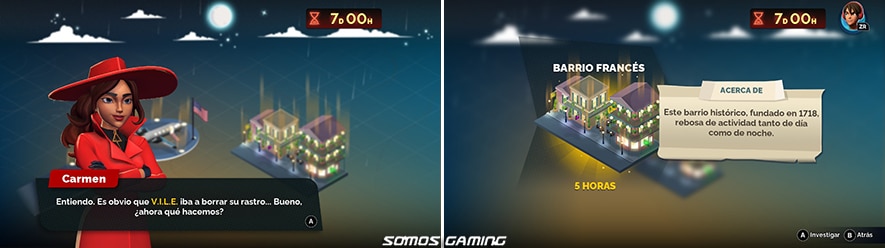 Ya desde el principio vemos a Carmen y su fedora, y si tenemos que hablar de su género, es una aventura detectivesca híbrida, con gran peso de la novela visual en “point and click”, un elemento de puzles de deducción y algunos minijuegos de acción. Hay que destacar el elemento educativo, que viene desde el inicio de esta saga. Por cierto, está completamente en español (aunque en las opciones dice “español, latino”).