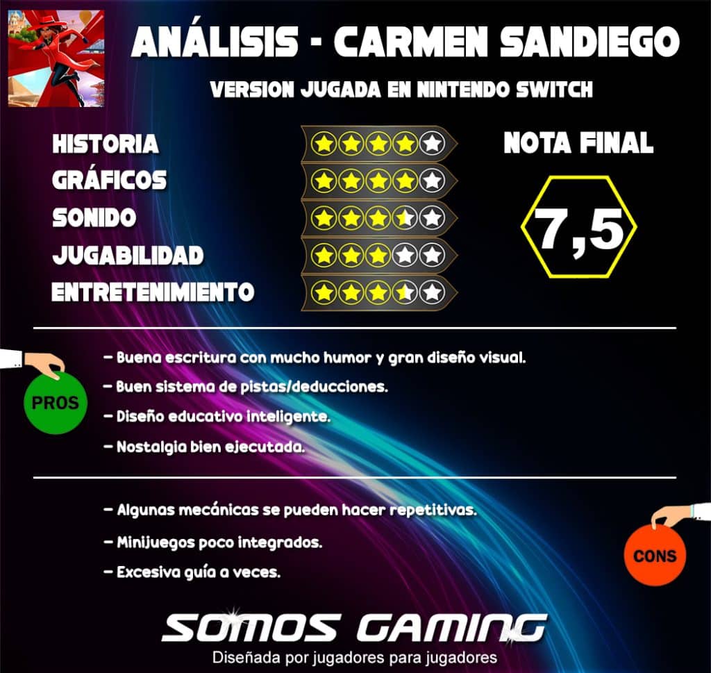 Cuando alguien cita a Carmen Sandiego está hablando de un elemento de infancia y de clásico súper relevante, que ha marcado el devenir jugón de mucha gente, y a veces, estas personas no conocen que esta serie de videojuegos basados en la icónica referencia de sombrero y gabardina roja sigue estando muy, muy presente. Tanto, que hoy en SomosGaming nos hemos dispuesto a realizar la reseña del juego más reciente de dicha saga, que hemos tenido el placer de poder probar gracias a los amigos de Meridiem y Gameloft, que nos han ofrecido una copia de su versión de Nintendo Switch. El juego ha sido lanzado en Switch el 4 de marzo de 2025, aunque lo hemos podido probar en este mes de mayo.