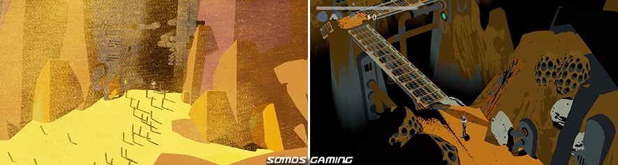 A nuestro personaje lo va siguiendo una cámara casi cenital en ocasiones y bastante lejana, que se va moviendo con mucho gusto, enseñándonos la desolación del desierto y la ciudad, todo en tonos pardos acompañados del sempiterno rugir de la tormenta, para pasar a un estilo de colores fuertes en las mazmorras, que contrasta con la oscuridad del resto de la pantalla.