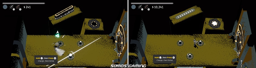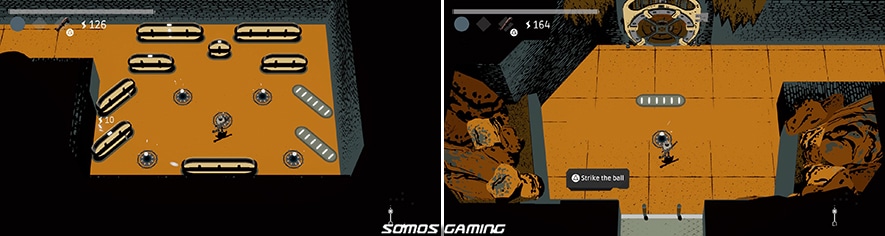 En otro lugar encontrarás un agujero donde entrar a las mazmorras, que es la parte del juego donde se desarrolla la acción. Al poco de entrar te topas con una orbe de energía sobre un pedestal y una puerta redonda y cerrada, a la que sí te acercas veras que pone “0/200 energía” (O lo que sea, hablo de memoria) En el suelo encontraras un trozo de tubería al estilo Street of rage II, tu primer arma, con la que golpearas la bola en dirección a unas barreras estilo pinball que te darán la energía necesaria para abrir la puerta y seguir avanzando.