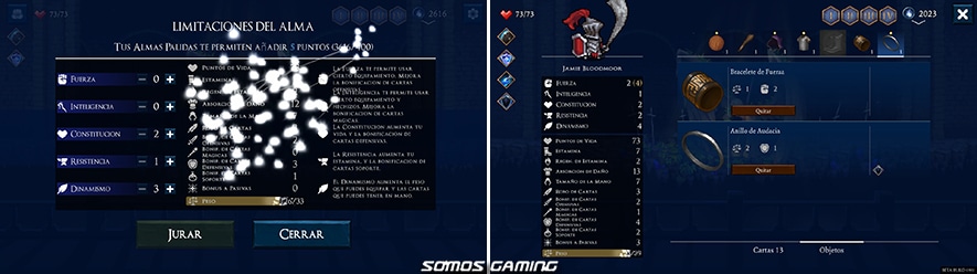 Todo esto redunda en una capa de personalización muy rolera que puede resultar muy interesante, si es que la dinámica del juego o los enemigos no resultaran tan caóticos. Los jugadores pueden mejorar atributos como fuerza, inteligencia y constitución, influenciando así sus estrategias de juego. Esto se hace pagando almas, a cambio de subir los puntos, al más puro estilo de los niveles en una partida de rol. Por otro lado, la compra de otras cartas, mejora de las mismas, compra de objetos, venta o mejora, incluyendo las reliquias, afecta directamente el estilo de juego y las tácticas empleadas en cada partida, ya que se pueden imbuir almas especiales en una espada o coraza dándole poderes especiales que redunden en el beneficio de nuestro estilo de juego.