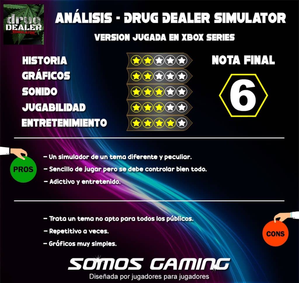 En numerosas ocasiones he manifestado mi devoción por todo simulador que pueda pasar por mis manos, y reconozco que se está llegando a un nivel de locura increíble en el género, pero nunca hubiera imaginado jugar a un simulador como este… En Drug Dealer Simulator, nos convertiremos en un traficante de drogas, si, tal cuál, enseguida os lo cuento. Pero primero debo decir que desde SomosGaming no apoyamos en absoluto el consumo o venta de drogas de ningún tipo, y que este juego y este análisis no sería apto para menores. Dicho esto, procedo a contaros como es este juego que nos han cedido los chicos de Ultimate Games.
