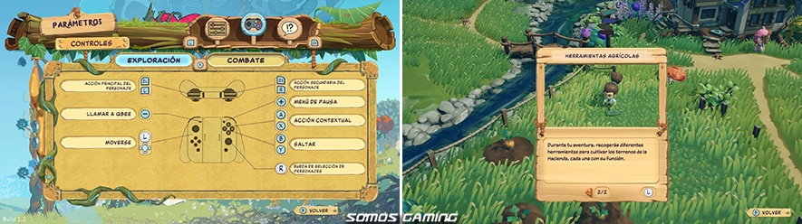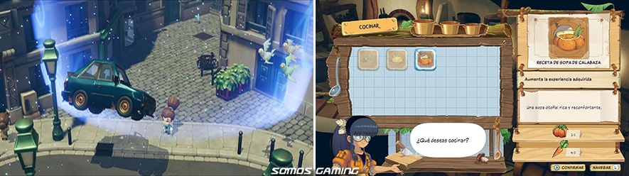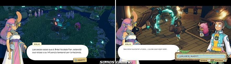 Quiero hacer un pequeño hincapié en la gestión de la hacienda, que se centra en la agricultura, la recolección de recursos y la interacción con los pintorescos habitantes. Podemos arar la tierra, plantar semillas (inicialmente zanahorias y trigo), recolectar las cosechas y utilizar estos recursos para progresar en la aventura. La mecánica de los «naturones», cristales verdes que emanan de las plantas saludables y que alimentan el «Árbol de las Mil Raíces», añade un componente de fuerte mensaje ecológico y de gestión a largo plazo. La interacción con personajes como Fenimale, la experta en botánica, y Becky, la ganadera (aunque inicialmente solo veamos pollos), nos da pie a varias misiones secundarias y una profundización en el lore del juego.