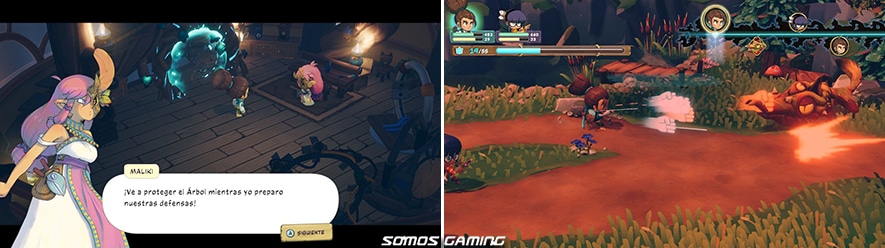 Maliki brilla en su dualidad de géneros y los combina de una manera totalmente integrada en la historia, ya que con esos dos puntos de RPG (combate e historia) y gestión de la Hacienda, tenemos un campo muy rico con el que disfrutar. La Hacienda funciona como un hub central que se expande al aportar los naturones (energía recolectada al cuidar plantas) al Árbol Temporal. Esto desbloquea nuevas zonas, parcelas de cultivo y misiones. Diversidad de herramientas añaden profundidad al sistema agrícola. Desde el punto de vista RPG, los combates por turnos con twist temporal son curiosísimos: los turnos se gestionan en una barra horizontal, y existen habilidades únicas que nos permiten aprovechas las habilidades temporales de las que disponen nuestros personajes cambiando turnos. La parte narrativa, ya dentro del juego, nos ofrece diálogos ligeros pero carismáticos, con toques de humor (como la obsesión de Fang por los huevos). La relación entre San y Maliki sugiere un misterio mayor, vinculado al cómic original… ¡Y me encantan estos crossover!