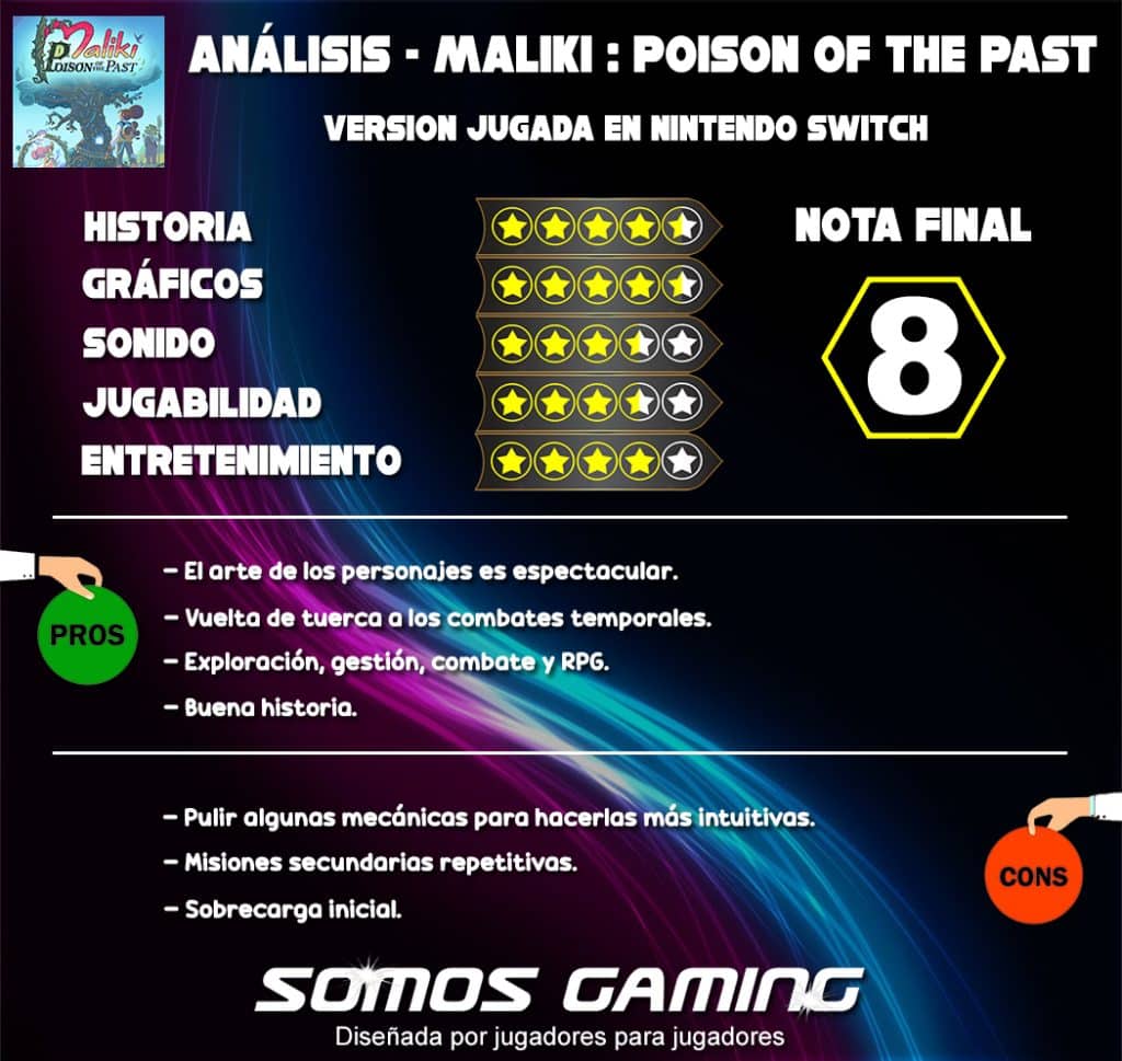 Maliki: Poison of the Past me ha parecido un juego que si bien no innova en los elementos narrativos, se presenta como una propuesta con toques de innovación interesantes dentro del género RPG. A destacar sobre todo su distintivo estilo gráfico y su guión bien elaborado, lleno de giros y con una notable traducción al español, que son puntos fuertes innegables. Lo raro que es ver un buen juego, aunque no innove demasiado en las mecánicas esenciales, hace de este un elemento a tener en cuenta. Su combinación de RPG con granja no aporta nada nuevo al mundo de los videojuegos pero con la profundidad de sus personajes y la mecánica de manipulación temporal en combate podemos decir que alcanzan un elemento diferenciador y desde luego de calidad potente. Sin embargo, el juego si que tiene algunos elementos negativos, como la dificultad a partir de la mitad de la aventura, donde algunos combates se vuelven excesivamente frustrantes y requieren una cantidad desproporcionada de intentos y grinding, o la cantidad de información inicial, o también que algunas animaciones se sienten algo rígidas. Las mecánicas no son tampoco todo lo intuitivas que podrían, pero eso no resta brillo a este buen juego.