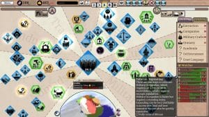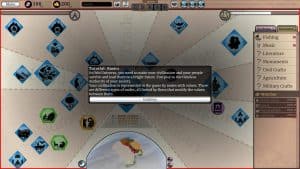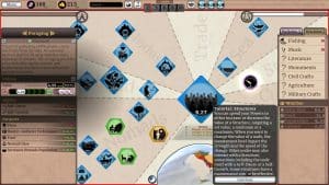 El comienzo del juego ofrece, gracias a Dios, un tutorial. En lugar de un tutorial lineal, se nos lanza directamente a la acción, eligiendo entre una serie de civilizaciones iniciales y un primer rasgo cultural que determina las fortalezas y debilidades de nuestro pueblo, mientras nos explica los diferentes elementos del juego, los diferentes tipos de nodos y sus interacciones. El juego no se centra en la construcción de edificios, sino en la gestión de nodos.