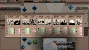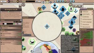 Religión y Cultura: Estos apartados son especialmente interesantes gracias a un sistema de «cartas» que otorgan bonificaciones y penalizaciones. Por ejemplo, se puede elegir un rasgo cultural que convierte a la civilización en agricultores excepcionales, pero a la vez, se les hace inútiles para la caza. La fe y las matemáticas pueden estar vinculadas, y la conversión de poblaciones paganas es un desafío constante.