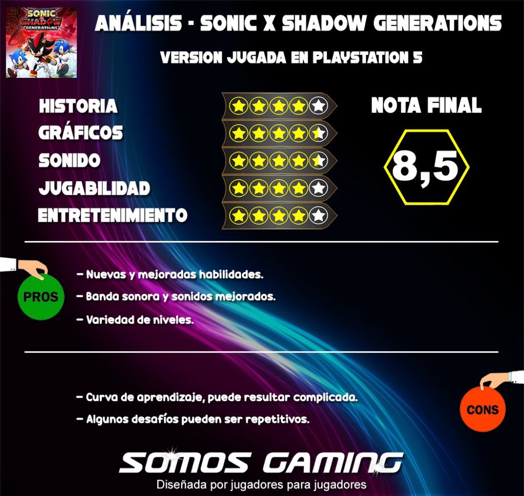Sonix X Shadow Generations, es una obra maestra que combina nostalgia y modernidad en un solo juego. Todo lo que aporta este juego, hace que sea un imprescindible para los fans de la saga Sonic, y una excelente opción para los nuevos jugadores, para así poder conocer e introducirse en el mundo de Sonic.