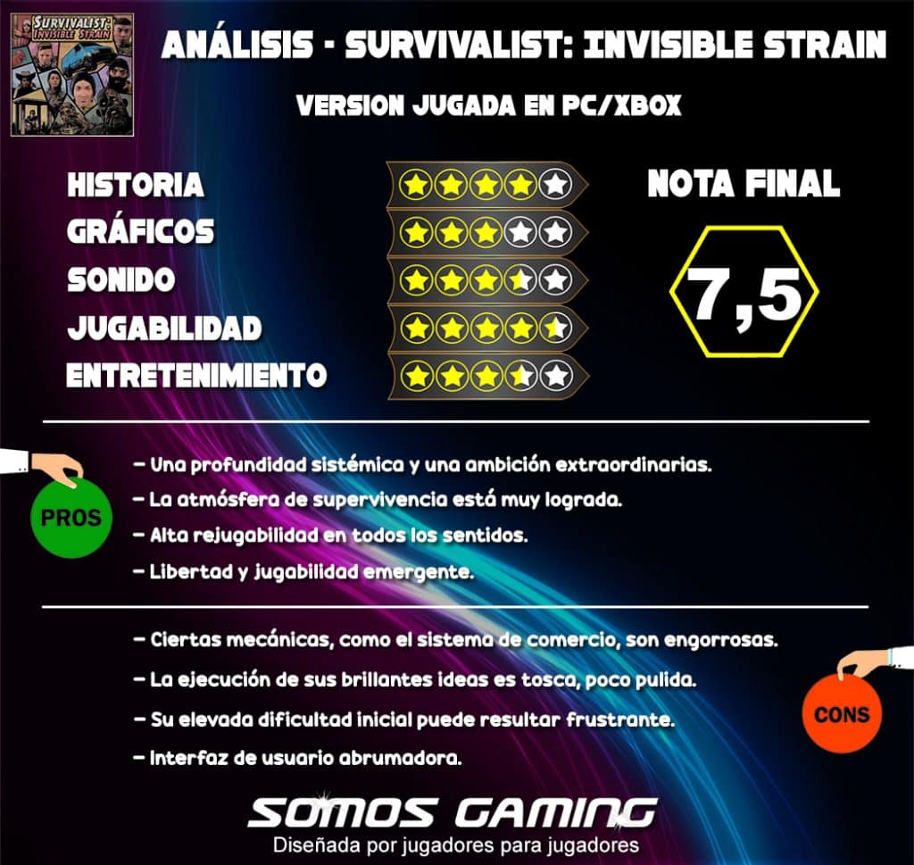 ¿Es una buena opción? Para el nicho de jugadores que buscan el simulador de supervivencia definitivo, que disfrutan con sistemas complejos y no les asusta una interfaz abrumadora y una falta de pulido general, Survivalist: Invisible Strain es una compra casi obligada. Es un juego que recompensa la paciencia y el intelecto. No obstante, si buscas una experiencia más accesible, pulida y cinematográfica, probablemente deberías mantenerte alejado.