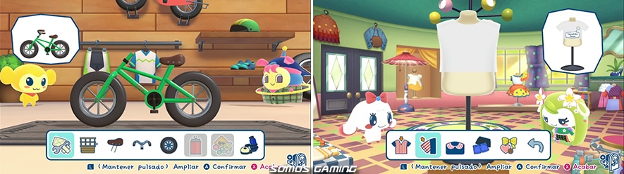 – Tienda de Bicis: Otro de los minijuegos más completos de este título viene de la mano de Unimarutchi. Aceptarás encargos para arreglar o personalizar las bicis de los tamagotchis. Cambia las ruedas, el sillín o el manillar al gusto del cliente y déjala bien limpita. Podremos cambiar el color así como añadir decoraciones si se da el caso. ¡Las bicis más molonas del planeta Tamagotchi!
