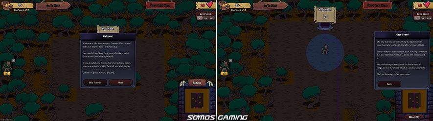 Lo más interesante de The Necromancer Cometh! es la libertad de estilo de juego. No hay reglas o construcciones preestablecidas que se deban seguir, lo cual me puso nervioso al principio, ya que este es mi primer juego de defensa de torres. Pero gracias al sistema de tutorial bien definido, acostumbrarse a los controles fue más fácil de lo esperado.