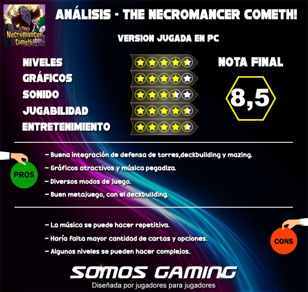 The Necromancer Cometh! se presenta como un juego híbrido, que mezcla mecánicas de defensa de torres con elementos de juegos de cartas, roguelike y construcción de laberintos. Esta mezcla resulta en una experiencia fresca y estratégica que desafía al jugador a pensar y reaccionar rápidamente. A primera vista, el juego se siente algo incompleto al estar en acceso anticipado, pero lo que ofrece es funcional y bastante prometedor. Con un modo campaña totalmente jugable y un modo interminable, el juego ya tiene una base sólida sobre la cual seguir creciendo.