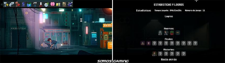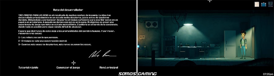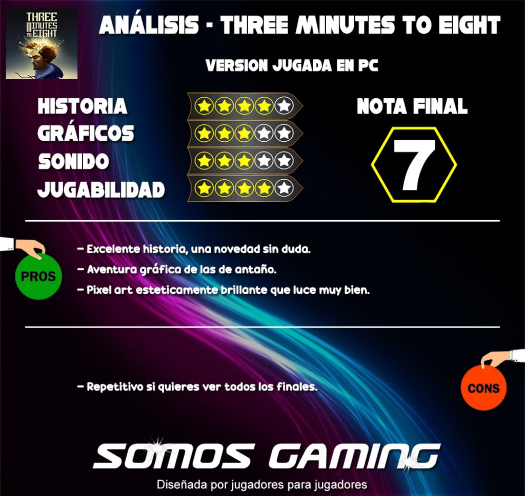 Estamos ante una de las aventuras gráficas de antaño en pixel art y con la novedad de una historia nunca vista en un juego. Así que mi enhorabuena para los desarrolladores del juego por este maravilloso Three Minutes To Eight.