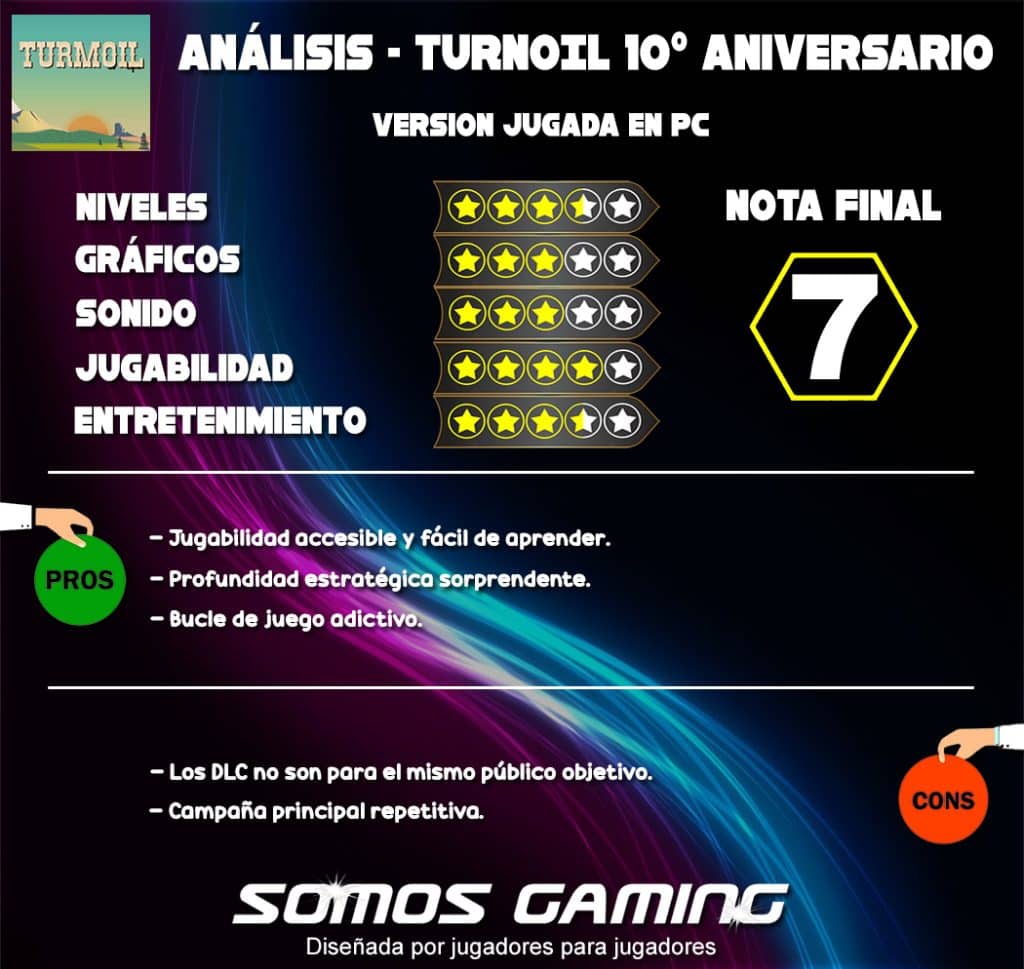 Justo tras el verano de 2024 hicimos el análisis de la última expansión de Turmoil que podéis ver aquí, que acababa de salir, y ahora, por su 10º Aniversario, hemos recibido de GamePress una clave para PC de una versión completa del juego, con los dos DLC (Deeper Underground y The heat is on), y hemos disfrutado, como siempre, de él.