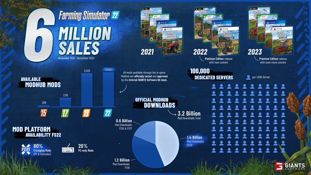 Las granjas virtuales están prosperando a medida que el editor y desarrollador GIANTS Software informa el creciente éxito de Farming Simulator 22: Incluyendo las posteriores Edición Platino y Edición Premium del juego, que ha vendido más de seis millones de copias desde su lanzamiento inicial en Noviembre de 2021. Se han alcanzado otros hitos en términos de actividad multijugador y modificaciones disponibles.