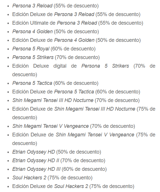 Además los aficionados a los juegos de rol pueden profundizar y explorar la rica historia de Atlus con los siguientes títulos, que también disfrutan de descuentos: