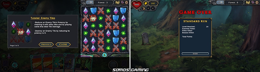 Por otro lado, tal cual se nos indica en la nota de prensa, la innovación del juego corresponde no al deckbuilding o al mapa de estilo roguelike, si no a la combinación con la idea de Puzzle Quest, esto es, el de unir elementos iguales en una cuadrícula…