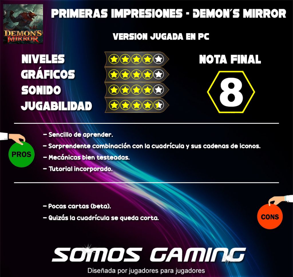 No es el juego completo lo que vemos, nos faltan las sinergias entre cartas, combos, las mejoras del personaje y la evolución a lo largo de diferentes mapas, pero si que parece que Demon’s Mirror tiene ese punto diferencial que puede hacer que alcance un punto bastante alto dentro de los deckbuildings con toque roguelike.