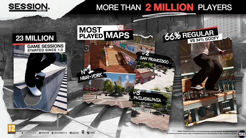 ¡NACON y creā-ture Studios se complacen en anunciar que Session: Skate Sim ha alcanzado una comunidad de más de 2 millones de jugadores! Lanzado en septiembre de 2022, esta simulación de skate ha conquistado constantemente a un número creciente de skaters y no skaters por igual, que se suman virtualmente a esta forma de patinaje. El juego rinde homenaje a la edad de oro del skateboarding de los años 90.