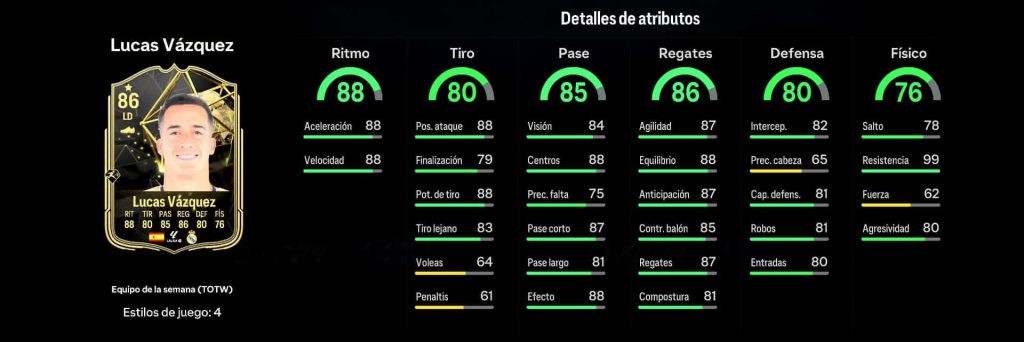 Lucas Vázquez es uno de los Featured IF de esta semana. El todoterreno del Real Madrid presenta su carta con 88 en ritmo nada mal para lateral y buenos atributos de pases con 88 en efecto y centros. Además en regates se maneja bien con 87 y también en anticipación. En cuanto a físico lo mejor su 99 en resistencia que aguantara todo el partido a tope. Eso si en defensa carece un poco de atributos, aunque si no tienes aun un LD mejor podría ser una opción interesante. Rondará por unas 40.000 monedas.