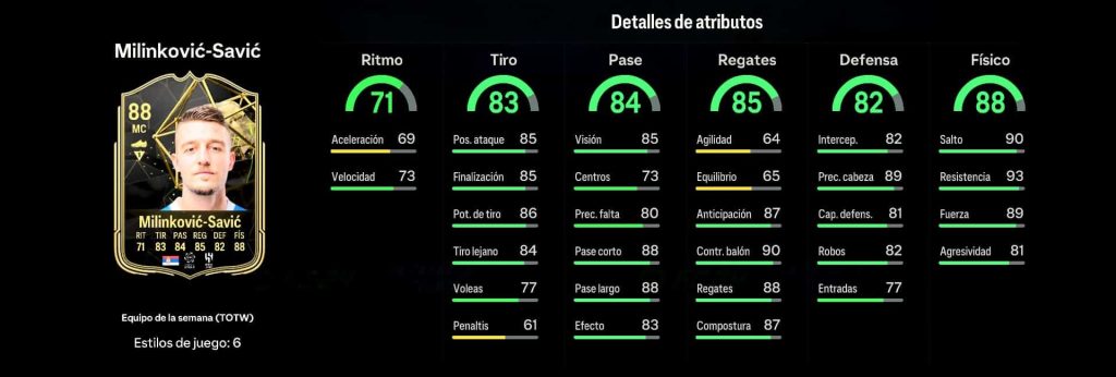Milinkovic Savic presenta su carta IF con unos atributos algo bajos y por su liga, para lo que hay actualmente y difícil de poder encajar pero bueno…Con 71 en ritmo y 84 en atributos generales de pase donde destaca su 88 en pase corto y largo. En los atributos de regates tiene 90 en control de balón con 88 en regates que puede ser aceptable. En cuanto a su físico destaca su 90 en salto y 93 en resistencia. Rondará por unas 50.000 monedas.