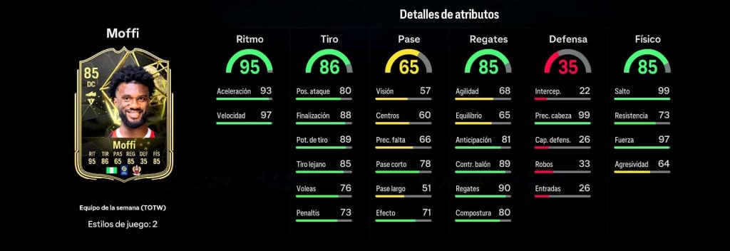 El nigeriano Moffi presenta su IF con sus buenos actuaciones en la Liga Uberts. Con un excelente 95 en ritmo y un 88 en finalización podría ser interesante. Además dispone de 90 en regates con un 89 en control de balón. En cuanto a su físico tiene 99 en salto y precisión de cabeza con un excelente 97 en fuerza que lo harán ser duro en los cuerpo a cuerpo. Rondará por unas 36.000 monedas.