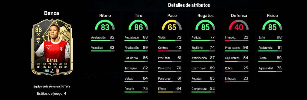 El francés Simon Banza de padres congoleños presenta su carta IF que además es otro de los Featured de esta semana. Si nos ponemos a mirar en lo que hay actualmente quizás se queda ya corta esta carta pero aun así puede ser de ayuda si juegas con plantilla de Liga Portuguesa. Destacamos su finalización en 89, una buena posición de ataque 88, con un buen control de balón 89, fuerza 89 y sobre todo 98 en salto que creemos que es el mejor en cuanto a salto no se si habrá alguien por encima, es lo mas destacable de esta carta. Rondará por las 30.000 monedas.