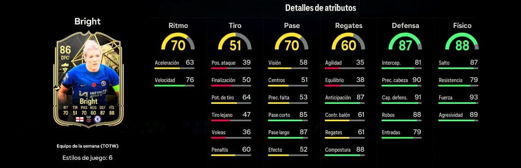 La carta de la británica Millie Bright es muy interesante. Quizás algo escaso en ritmo con 70 pero con unos atributos defensivos realmente buenos. Robos en 88, capacidad defensiva 91 y precisión de cabeza en 90 lo mas destacado. Además de tener una fuerza en 93 con buena agresividad en 89 puede ser interesante para formar cerrojo atrás y sobre todo evitar los remates en los córner. Tiene también buen anticipación con 87. Rondará por las 30.000 monedas.