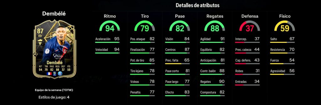 La carta del francés será muy atractiva por su ritmo si juegas con extremos. Si su carta oro ya es una locura este lo mejora en ciertas aspectos. Con 94 de ritmo, 85 potencia de tiro, 91 en agilidad y 90 en regates, lo hacen un verdadero extremo rápido y potente, difícil de parar. Si su carta oro ya es tan bien tasada esta debe de ser algo cara. Rondará por las 520.000 monedas