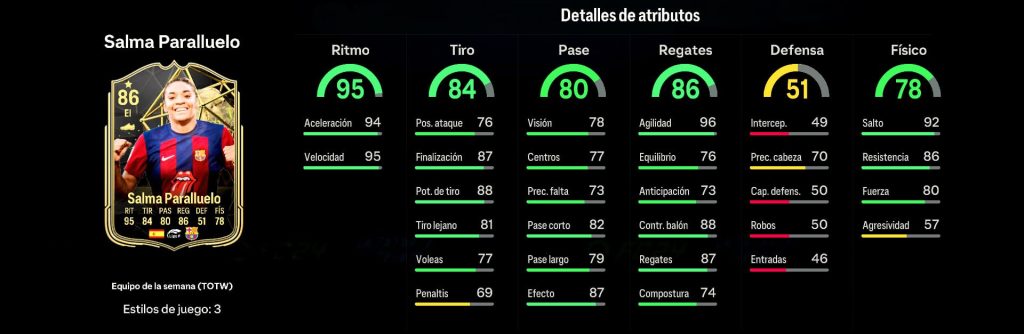 La carta de la Campeona del Mundo Salma es muy atractiva por varios motivos. No solo por su ritmo que ya es tremendo con ese 95 y además bien equilibrado, sino también por habilidad en el regate con 87 y 88 de control de balón. Bastante fuerza con 92 en salto, puede ser interesante para las jugadas a balón parado. Además como extremo podría hacer diagonales para finalizar ya que tiene 87 de estadística y puede funcionar muy bien. Sin duda una carta a tener muy en cuenta además de ser la IF Featured de esta semana, que aunque hay varios Salma es una de ellas. Rondará por las 250.000 monedas.