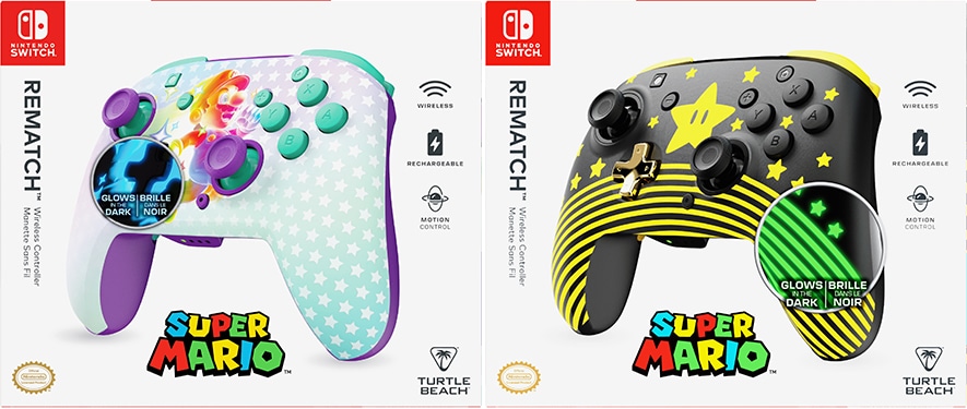 El mando inalámbrico Rematch Invincible Mario para consolas Nintendo Switch pone en las manos de los jugadores un encanto retro inspirado en los potenciadores, mientras que el diseño Rematch Super Mario™ Star  potencia las sesiones de juego haciendo brillar cada movimiento. Ambos nuevos modelos iluminan las salas de juego más oscuras con diseños que brillan en la oscuridad después de la exposición a la luz. Para largas sesiones de juego, los jugadores apreciarán la batería recargable de hasta 40 horas y el alcance inalámbrico de más de 9 metros para jugar cómodamente desde cualquier lugar de la habitación. Los jugadores de Nintendo Switch pueden sumergirse por completo en sus juegos favoritos como Super Mario Party™ Jamboree y Mario Kart™ 8 Deluxe con controles de movimiento incorporados. Dos botones asignables mejoran las acciones en el juego. Disponible por PVP de 59.99 € en tiendas participantes.